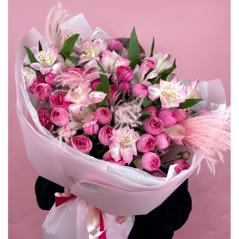 Размер M - 219 BYN ( 11 кустовых пионовидных роз, 6 альстромерий, стифа, упаковка)