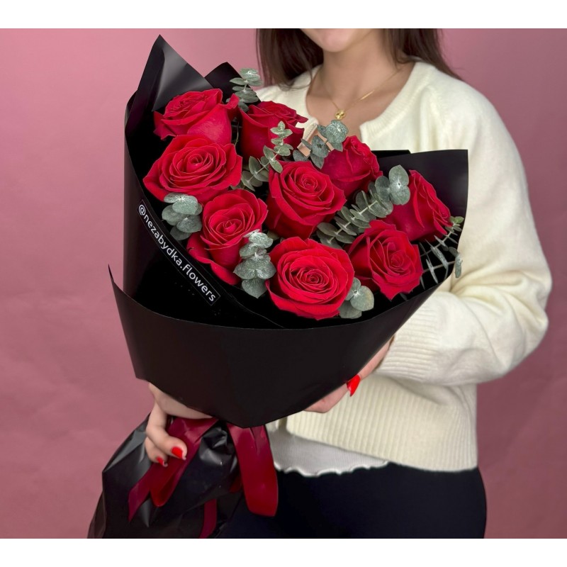 «11 красных роз Эквадор с эвкалиптом в чёрной упаковке»